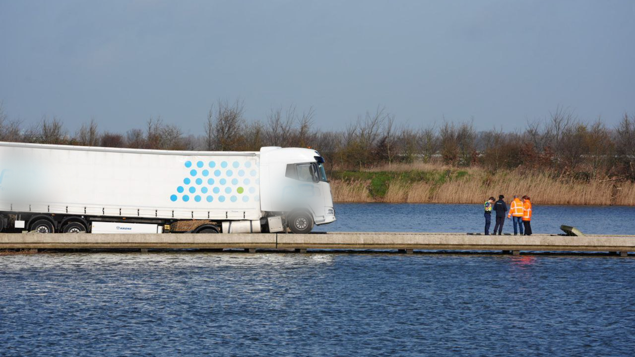 Door de klap zijn de brandstoftanks van de vrachtwagen gescheurd. Vermoedelijk zijn honderden liters diesel in het water terechtgekomen.