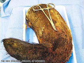 Dokters hebben uit de buik van een jonge vrouw uit Chicago een haarbal van dik vijf kilo gehaald, meldt de New England Journal of Medecine. De 18-jarige studente had al vijf maanden klachten over buikpijn en "voelde zich opgeblazen", zo schrijven de behandelende artsen Ronald M Levy en Srinadh Komanduri. Ze was ook 20 kilo afgevallen. Een scan bracht een onwaarschijnlijke hoeveelheid haar aan het licht in haar maag en in haar buik. De artsen haalden de haarbal eruit, 30 bij 15 cm groot. Vijf dagen later mocht de patiënte naar huis. Ze is volledig hersteld. Het meisje in kwestie leed aan trichophagia, een medische conditie waardoor mensen hun eigen haar gaan opeten.