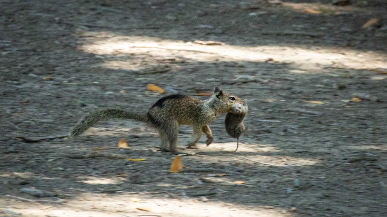 De biologen observeren al twaalf jaar lang eekhoorns in Briones Regional Park, in de buurt van San Francisco. Maar tussen juni en juli van dit jaar registreerden ze 74 interacties tussen grondeekhoorns en woelmuizen, en in 42 procent van de gevallen was er sprake van jachtgedrag.