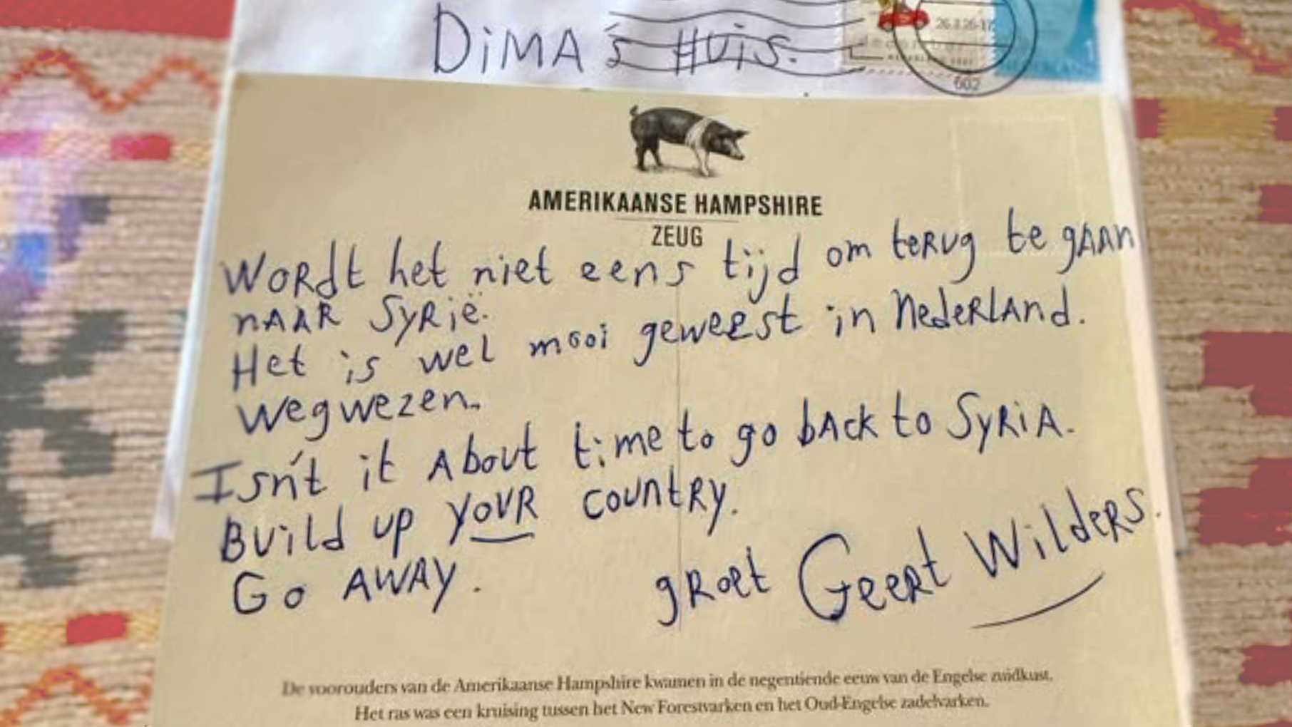 De tekst op het kaartje laat aan de verbeelding niets te wensen over. “Wordt het niet eens tijd om terug te gaan naar Syrië. Het is wel mooi geweest in Nederland. Wegwezen.” Als afzender staat de naam van Geert Wilders op de kaart. Dima gelooft niet dat hij de afzender is. “Waarschijnlijk een van zijn aanhangers.”