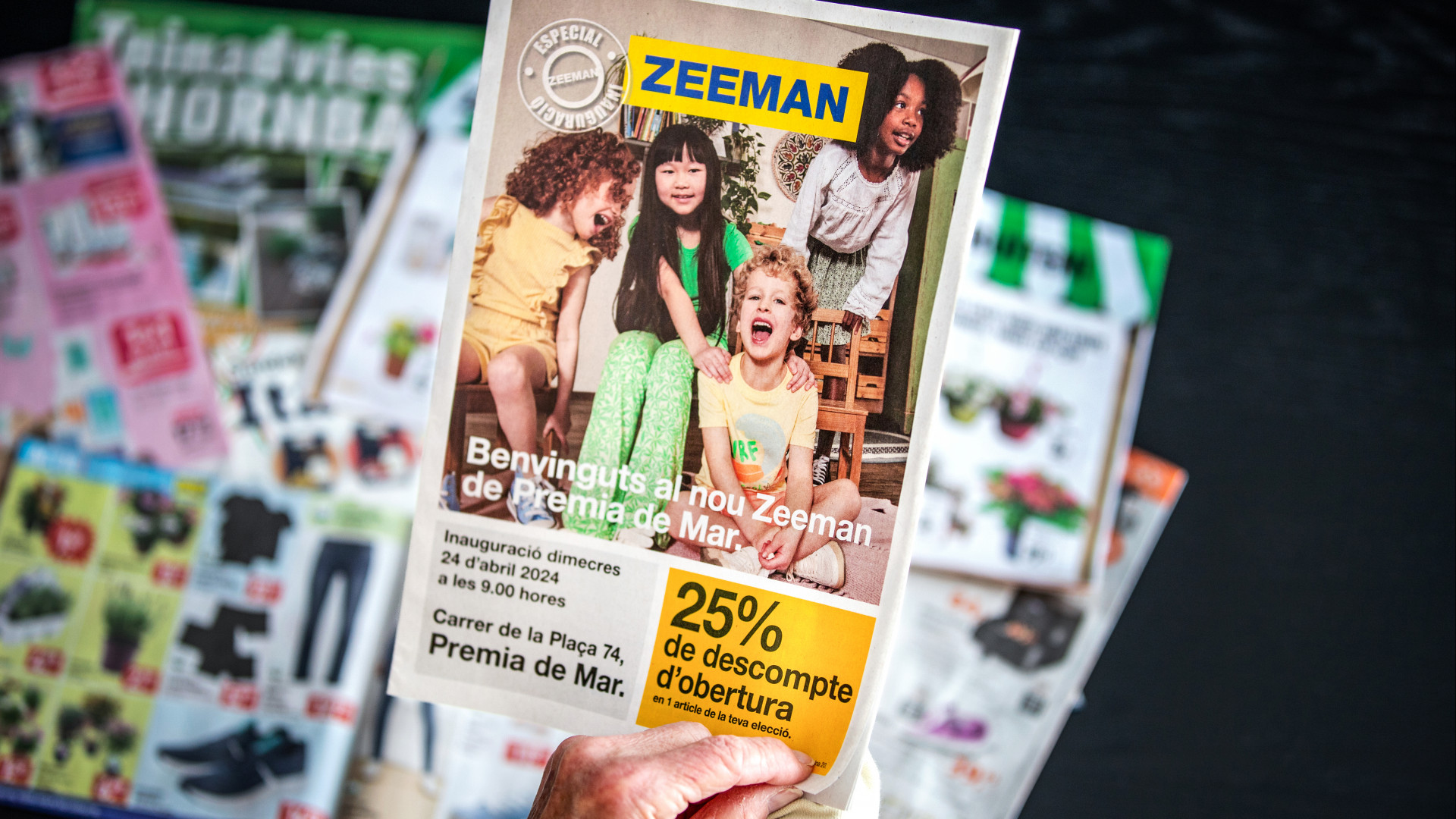 Op de voorkant staat de tekst: 'Benvinguts al nou Zeeman de Premia de Mar.' En ook: '25% de descompte d'obertura en 1 article de la teva elecció.' Dat is Catalaans voor: 'Welkom bij de nieuwe Zeeman in Premia de Mar. 25 procent openingskorting op een artikel naar keuze.'