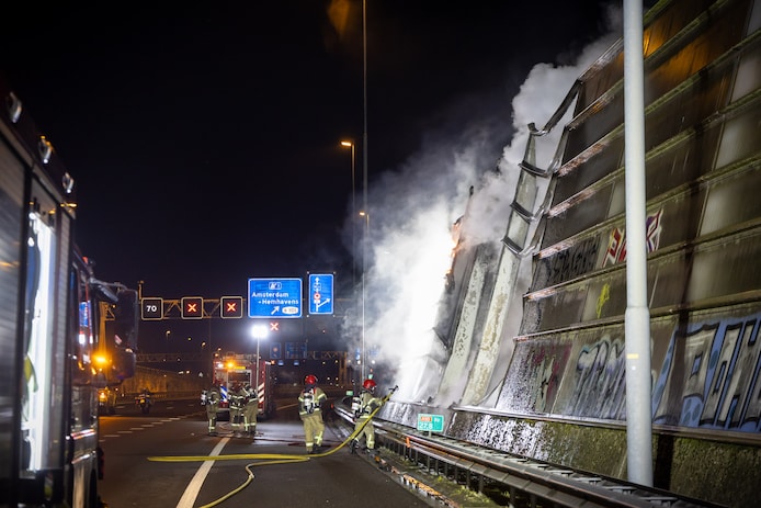 Langs de A10 Ringweg-West is maandagochtend brand uitgebroken in een geluidwal bij hectometerpaal 27,8. De vlammen waren metershoog en goed zichtbaar vanaf de weg. De brandweer heeft het vuur geblust.