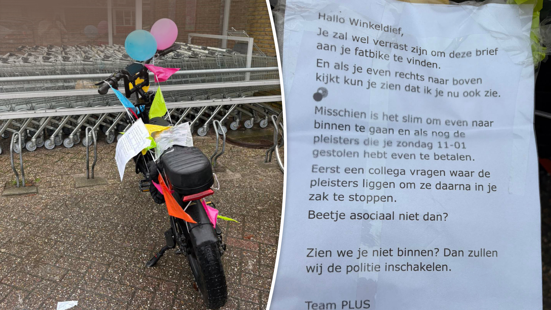 De volgende dag staat de elektrische fiets nog altijd bij PLUS Wemekamp. Een ideale kans om op die manier de dief te confronteren, zo denkt de onderneemster. "Het is een dure fiets, die laat je niet staan." Medewerkers van de supermarkt versieren de fatbike met vlaggetjes en ballonnen, inclusief foto's van de dief en een verzoekje aan de man.