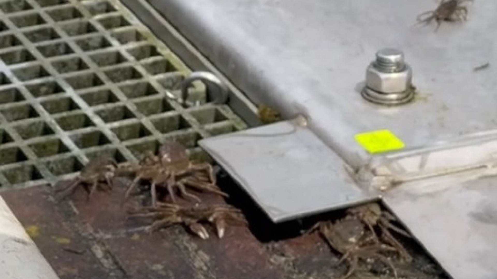 'Je zit dan lekker nog buiten te kletsen en dan komt er ineens zo'n krab onder je tuinstoel vandaan. Je krijgt er echt een hartverzakking van', zegt De Ruiter. Haar videobeelden van de tienpotigen zijn overduidelijk, waarop te zien is hoe de beesten rustig onder de dorpel schuilen. 'Ze willen gewoon bij je naar binnen.'