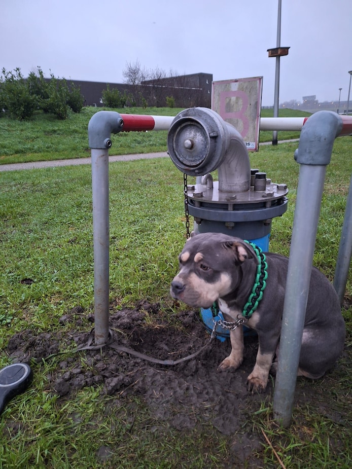 Moederziel alleen zat ze, aan een paaltje vastgebonden vlak bij de begraafplaats van Maassluis. ‘In de kou, in de regen’, aldus de Dierenambulance West Nederland, die op zoek is naar het baasje van het dier.