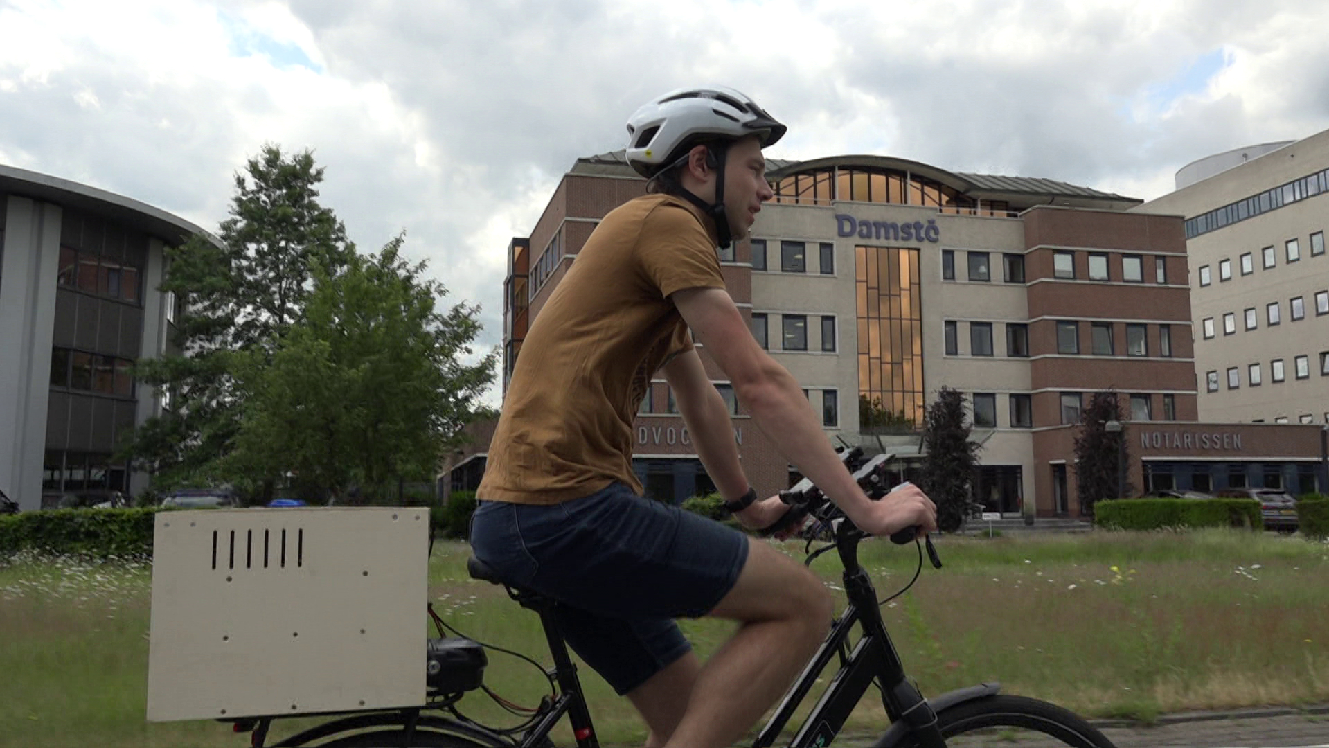 Frank Hemme, masterstudent Civil Engineering en lid van het projectteam, laat zien hoe de techniek werkt. "In de bak achterop de fiets zit een Jetson Nano, wat een minicomputer is. En die computer voert alle berekeningen uit."