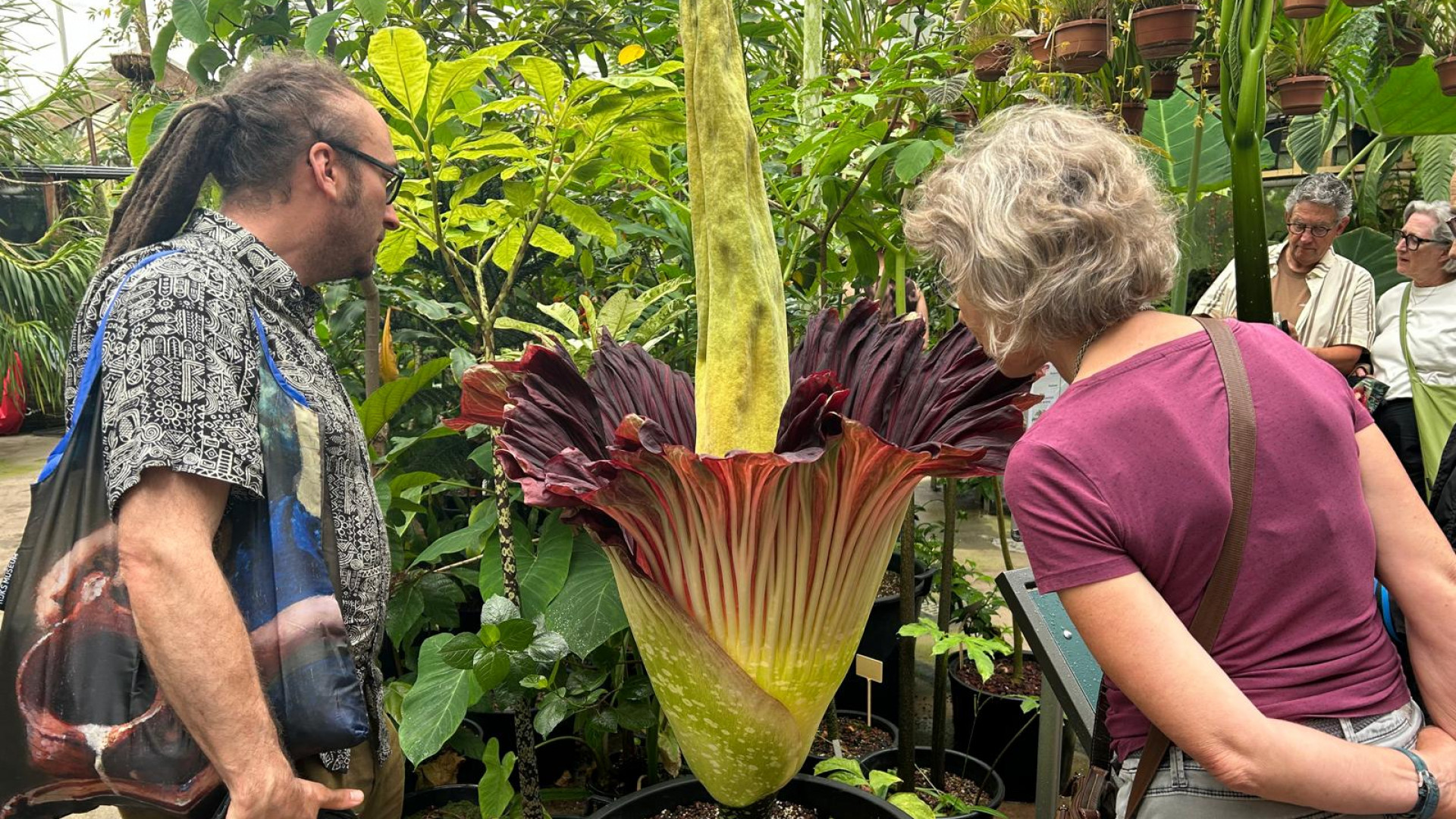 Het is een enorme paarsachtige kelk waar een stamper van reuzeformaat uitsteekt. De Leidse hortus heeft meerdere exemplaren van de Amorphophallus, daardoor kan de bijzondere plant regelmatig in volle glorie bewonderd worden.