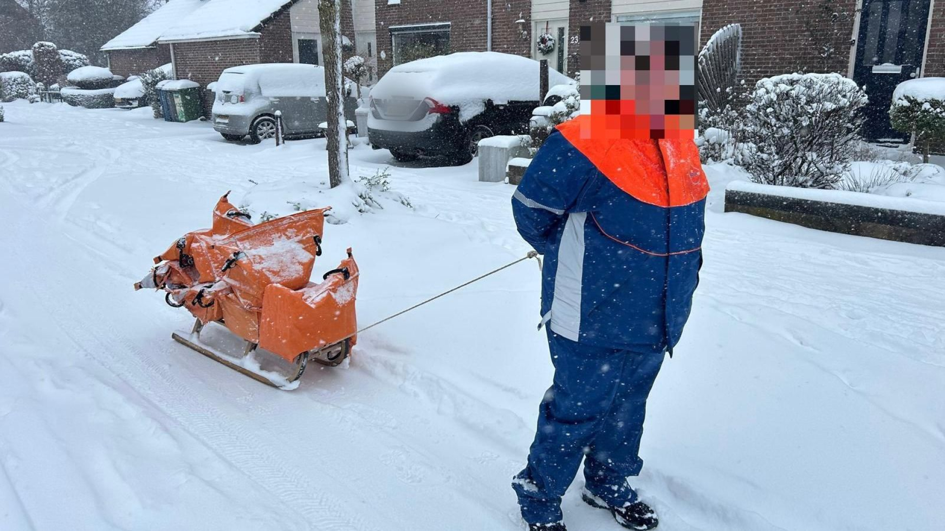 Vaste volger van Omroep Gelderland Rob stuurt een foto van een zeer vindingrijke postbode. Die bezorgt niet per fiets of per karretje, maar per slee.